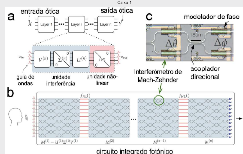 Mais recentemente, a integração de guias de onda ópticos e múltiplos componentes óticos em circuitos fotónicos, uma tecnologia designada por silicon photonics, está a substituir componentes eletrónicos em telecomunicações, permitindo velocidades mais elevadas, maior capacidade de transmissão de dados e uma eficiência energética significativamente superior. O uso de fotões em vez de eletrões tem ganhado importância nas telecomunicações, mas também na própria informática e inteligência artificial. Ainda na sua infância, as redes neuronais óticas (Optical Neural Networks) [1] usam luz para processar informações de forma simultânea e paralela, explorando o comportamento natural da interferência óptica para realizar operações matemáticas complexas, a altíssimas velocidades e muito menor consumo energético. Startups como a Neurophos têm vindo a desenvolver unidades de processamento óptico (Optical Processing Units, OPUs), prometendo reduzir em milhares de vezes o consumo energético necessário para tarefas de machine learning (ver Caixa 1).